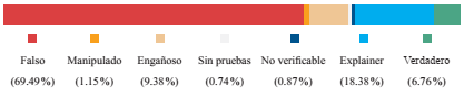 El desequilibrio es aún mayor si se aglutinan los veredictos de negatividad -el propio “Falso”, junto a “Manipulado” y “Engañoso”-, que alcanzan un 80 %. El resto de la muestra comprendería veredictos que no son en esencia ni negativos ni positivos, en concreto “Explainer” -un 18.38 % del total-, “No verificable” -0.87 %- y “Sin pruebas” -un 0.74 %-.