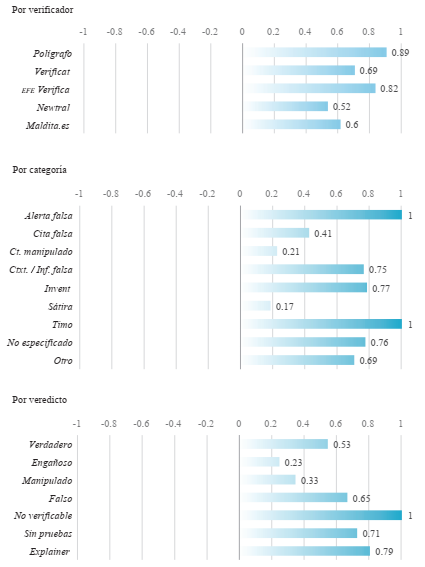 Mayores son las diferencias si se atiende a la categoría de las publicaciones, pero en este caso sí es conveniente tener en cuenta el número de elementos de cada una. Así, las categorías “Alerta falsa” y “Timo” muestran un valor 1 -el más a la derecha posible-, pero cabe tener en cuenta que en estos casos las muestras son apenas de tres y un elemento, respectivamente. Sucede lo mismo con las categorías “Sátira” -12 elementos- y “No especificado” -17 elementos-, que obtienen valores de 0.17 -el menor sesgo de todos- y 0.76, respectivamente.