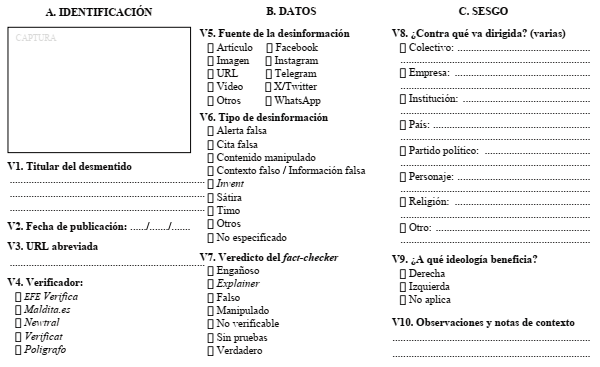 La aproximación cuantitativa y el análisis de contenido se llevaron a cabo utilizando una ficha de recogida de datos (ver Anexo) diseñada ad hoc que permitió tomar los datos identificativos -captura, titular, fecha, fact-checker y URL- y de contenido -fuente y tipo de la desinformación y veredicto del fact-checker- de cada uno de los desmentidos proporcionados por la API, a los que se añade un tercer bloque destinado a analizar los posibles sesgos -contra qué va dirigida la desinformación, a qué ideología beneficia y notas de contexto-. Los datos obtenidos fueron procesados posteriormente usando Google Forms para su incorporación conjunta en formato de hoja de cálculo digitalizada.