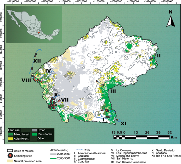 The basin of Mexico is located between 98-100º W and 19-20º N (Fig. 1). It was initially endorheic and was later artificially opened to the Pánuco River basin. It is surrounded by large mountains and/or volcanoes of the Trans-Mexican Volcanic Belt (the Ajusco to the south, the Sierra Nevada to the east, and the Sierra de las Cruces to the west). To the north, it is limited by a succession of mountains and hills (The Pitos, Tepotzotlán, Patlachique, and Santa Catarina), and to the southeast, the Popocatepetl and Iztaccihuatl volcanoes surround the basin. According to Ferrusquía-Villafranca (1993) and Legorreta (2009), 45 rivers that are still reported to exist descend from this system of mountains. The basin has an approximate area of 9600 km2, encompassing territories of the State of Mexico (50%), Hidalgo (26.5%), Mexico City (13.8%), Tlaxcala (8.7%), and Puebla (1%). Of the total area, 5136 km2 (53.5%) are flat terrain and hillslopes (2250-2400 masl), and low slopes (2-12º). The remaining 4464 km2 (46.5%) are mountainous terrain (> 2400 masl) with a steep slope (2-12º) (Lugo-Hubp 1990). In the latter, about 2000 km2 (44.8%) are occupied by human settlements, in most cases irregular because they are located in mountainous areas of ecological importance (Perló and González 2005, Aguilar 2008). From a biogeographical point of view, the rivers and springs in the basin are classified as subtropical mountain rivers (altitudes greater than 2200 masl). The rainfall (total annual precipitation of 600-1200 mm) and temperature (5-25 ºC) variation throughout the year generate a biological community with greater affinity to temperate or boreal regions (Bojorge et al. 2010). Ninety-two percent of the sites were located in the upper basin (> 2800 masl) and 8% in the lower basin (< 2800 masl). According to Legorreta (2009), the rivers and surface springs are born and run through superficial stretches between 5600 and 3200 masl altitudes before being piped in the lower basin. According to the Instituto Nacional de Geografía y Estadística (National Institute of Statistics and Geography; INEGI 2013), 70% of the land in the Basin of Mexico is used to develop primary activities (livestock, agriculture, and forestry), and 20% of the land is urban, covering most of the territory of Mexico City and some areas of the State of Mexico. Forests of Pinus, Abies, and mixed represent the vegetation. The rivers and springs of the basin originate in the mountainous areas surrounding the Basin of Mexico and are mostly modified with hydraulic infrastructure, such as small dams, diversion channels, and extraction with hoses, among others (Legorreta 2019). Other springs are owned by private agencies or used for local domestic and economic needs. The rivers circulate on different slopes for stretches of several kilometers before mixing with sewage that originates from anthropogenic activities in the urban area of the city (Legorreta 2019).