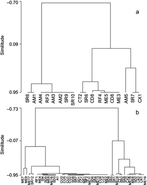 Fig. 2 Hierarchical agglomerative cluster recognizing two clusters of sites: (a) over 2800 masl, and (b) under 2800, based on the hydromorphological quality index, dissolved inorganic nitrogen, and soluble reactive phosphorus data. (AM1: La Castañeda, AM2: La Castañeda II, AM3: La Castañeda III, AM4: La Castañeda IV, AM5: La Castañeda V, CT1: Rancho Nuevo I, CT2: Rancho Nuevo II, CX1: Miraflores, CX2: Santa Catarina, CU1: Los Organillos, CU2: Capoxi spring, CU3: San Pedro spring, CU4: Presa Iturbide spring, CU5: Capoxi, LC1: La Caldera, LC2: Xopachi, LR1: Monte Alegre 1, LR2: Monte Alegre 2, ME1: Chautitle, ME2: Chautitle waterfall, ME3: Confluencia, ME4: Eslava spring, ME5: Santa Teresa, ME6: Truchero, SI1: Las Palomas, SI2: Truchero 2, SR1: Agua Dulce, SR2: San Rafael channel, SR3: Compañía 1, SR4: Compañía 2, SR5: Cosamala 1, SR6: Cosamala 2, SR7: UAM station, SR7: San Rafael channel 1, SR8: San Rafael, SR9: San Rafael channel 2, SR10: San Rafael path, SD1: Arroyo Desierto, SD2: Convento, SD3: La Capilla Santa Rosa, SD4: Santa Rosa 1, SD5: Santa Rosa spring, SD6: Santa Rosa 2, SD7: Truchero, SD8: Valle de Monjas, A1: Apatlaco, RF1: El Llano 1, RF2: El Llano 2, RF3: La Cabañita, RF4: La Planta, ME7: Cañada de Cuervos spring, ME8: Cañada de Cuervos, ME9: Cieneguillas dam, ME10: Cieneguillas 1, ME11: Cieneguillas 2, ME12: Temascalco, ME13: La Rosita Alto, ME14: La Rosita spring, ME15: Ermita spring, ME16: San José spring, ME17: La Bodega spring, ME18: Potrero spring.)