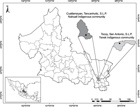 El estudio se realizó en dos comunidades indígenas, Cuatlamayán (CUA) y Tocoy (TOC) ubicadas en la zona conocida como Huasteca Potosina en el estado de San Luis Potosí (SLP), México (Fig. 1). Cuatlamayán se localiza en las coordenadas 21º 35’ 21” N, 98º 56’ 13” O en el municipio de Tancanhuitz con una altitud media de 170 msnm. El clima es semicálido con fuertes lluvias durante el verano. La temperatura media anual es de 23.4 ºC y la precipitación media anual es de 2267.2 mm. Tocoy se encuentra en el municipio de San Antonio en las coordenadas 21º 38’ 21” N y 98º 52’ 14” O, con una altitud media de 200 msnm. El clima es semicálido húmedo, con una temperatura media anual de 22 a 24 ºC y una precipitación media anual de 1800 a 2000 mm (CNA 2025). El escenario en ambas comunidades es muy similar, siendo los cítricos en Cuatlamayán y la caña de azúcar en Tocoy los usos agrícolas predominantes de la tierra. En ambos cultivos se aplican grandes cantidades de insecticidas y herbicidas. Ambas son zonas endémicas de paludismo y dengue. Se utiliza leña para cocinar y la quema de basura orgánica e inorgánica es una práctica habitual.