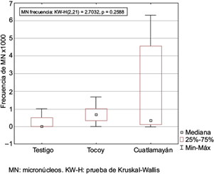La figura 2 muestra la frecuencia de MN en sapos testigo (0.2), sapos capturados en Tocoy (0.7) y Cuatlamayán (1.9). A pesar de haber una mayor frecuencia de MN en Cuatlamayán no hay diferencia estadísticamente significativa con lo registrado en los sapos capturados en Tocoy y los sapos testigo, debido a que el escenario de exposición es el mismo en ambas comunidades. No se registró una asociación entre las concentraciones de COP en tejidos y la frecuencia de MN. Es importante mencionar que en Cuatlamayán y Tocoy se realizan otras actividades que agregan contaminantes genotóxicos (hidrocarburos aromáticos policíclicos [HAP], ftalatos, organofosforados, carbamatos), como cocinar con leña, quema de basura y agricultura, las cuales no han sido consideradas en el presente estudio. Por lo tanto, el efecto observado en los sapos podría ser el resultado de una mezcla de contaminantes que no fueron evaluados.