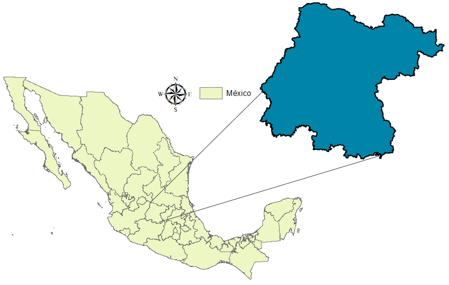 En la presente investigación se ha usado como caso de estudio el estado de Guanajuato, que cuenta con un área de 30 606 km² (Conagua, 2022) y representa el 1.6% del territorio mexicano (Figura 1). Se ha seleccionado este estado por las problemáticas hídricas que enfrenta el bajío mexicano. Además, el estado se encuentra en la región semiárida de México, con importantes desafíos por su clima árido y por sus características geográficas y ambientales particulares. El 43% de la superficie del estado se caracteriza por un clima seco y semiseco en la región norte, el 33% por un clima cálido subhúmedo en la parte suroeste y el 24% restante por un clima templado subhúmedo (Coordinación Estatal de Protección Civil de Guanajuato [CEPCG], 2018). La temperatura promedio más alta oscila los 30 °C, la cual se presenta en los meses de mayo y junio, y la más baja oscila los 5.2 °C, en el mes de enero (CEPCG, 2018).