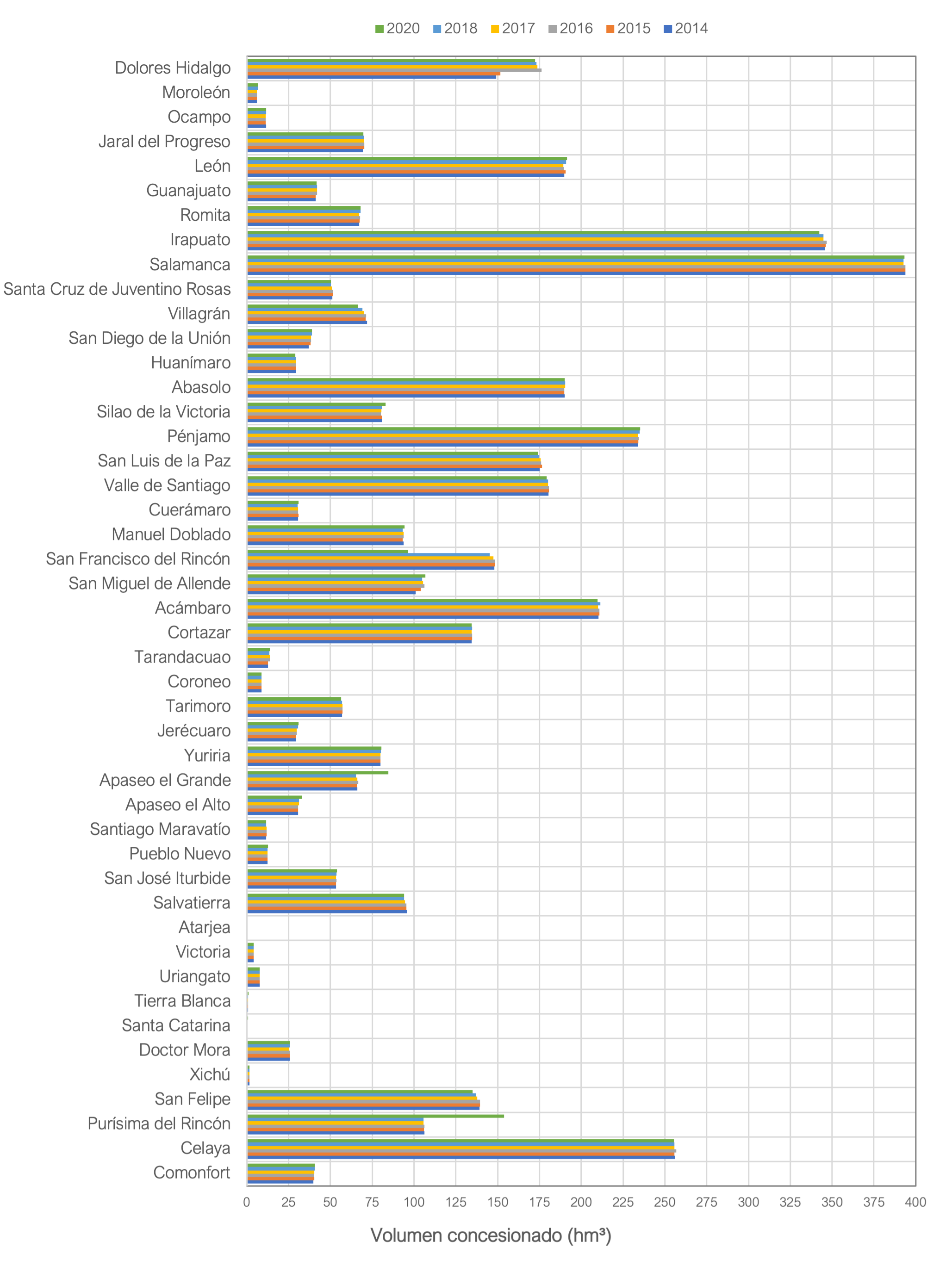 Con base en la información del Registro Público de Derechos del Agua administrado por la Conagua (Repda-Conagua), los municipios con volúmenes concesionados más altos son Salamanca, Irapuato, Celaya, Pénjamo y Acámbaro (Figura 2). Lo anterior se debe a la combinación de usos consuntivos con importantes demandas agrícolas e industriales.