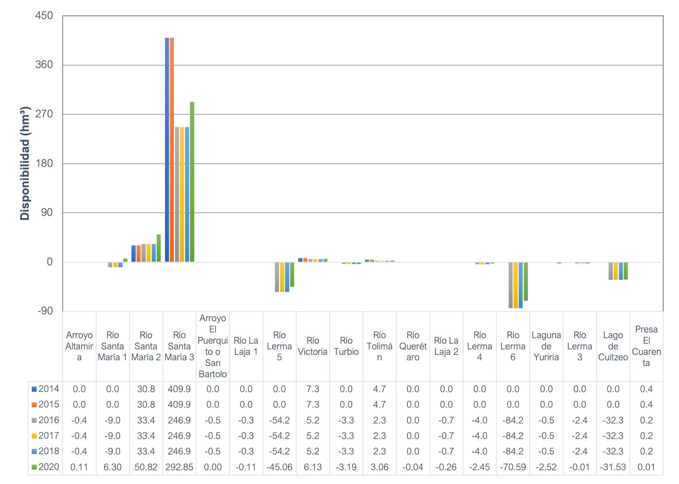 Como se puede observar, el mayor uso consuntivo es el agrícola. Y es que en el estado de Guanajuato se tiene una superficie agrícola de 1 231 000 ha. Dos terceras partes del área agrícola tienen un régimen de humedad de temporal, en tanto que la tercera parte restante (437 000 ha) cuenta con riego. De la superficie con riego, aproximadamente 250 000 ha (20% del total de la superficie agrícola) utilizan agua subterránea. Por otra parte, las 187 000 ha restantes del área agrícola con riego (15%) usan agua de fuentes superficiales, como son: presas, bordos y pequeñas obras de irrigación (SDAyR, 2020). Con base en los usos consuntivos mencionados, y de acuerdo con la información reportada en el SINA-Conagua para el periodo de 2014 al 2020, la disponibilidad superficial y subterránea en el estado presenta déficits significativos y con variación espaciotemporal importante (Figura 3 y 4).