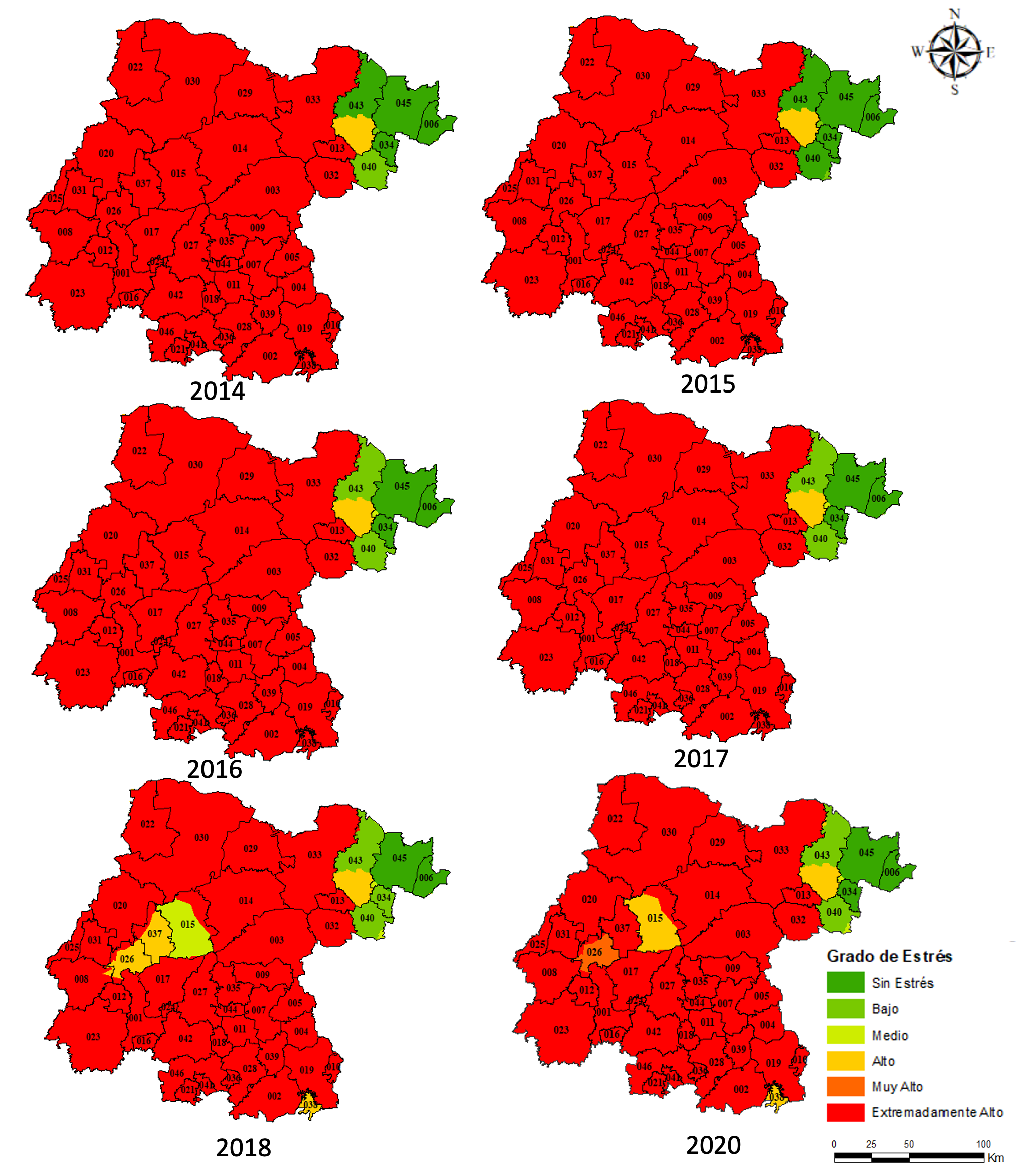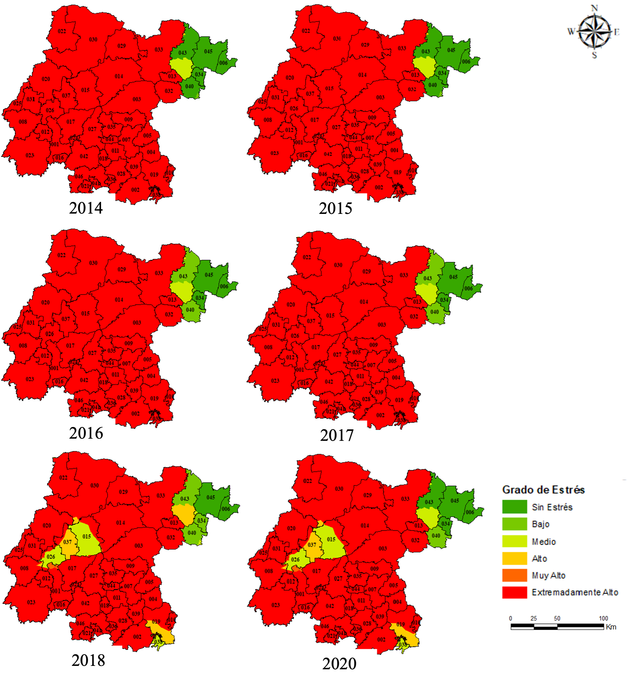 En el caso de los resultados bajo el escenario de riego tecnificado por goteo se ha obtenido que la mayoría de los municipios del estado no presentan cambios en su estrés hídrico durante el periodo evaluado (Figura 6). También se ha observado que solo el 11% de los municipios han cambiado su grado de estrés hídrico de extremadamente alto a niveles más bajos, mejorando su condición de alto a medio, de medio a bajo, o incluso alcanzando el nivel sin estrés hídrico (Figura 6). Sin embargo, los efectos del riego tecnificado por goteo en la disminución del estrés hídrico ocurren después de seis años (el año 2020); es decir, se observa la recuperación de la disponibilidad hídrica en algunos municipios y también el nivel más bajo de estrés hídrico en otros.