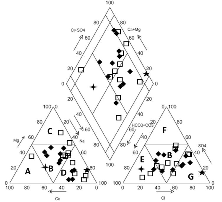 ). A = Calcium Type, B = no dominant type, C = Magnesium type, D = Sodium and potassium type, E = Bicarbonate type, F = Sulfate type and G = Chloride type. Typical seawater (