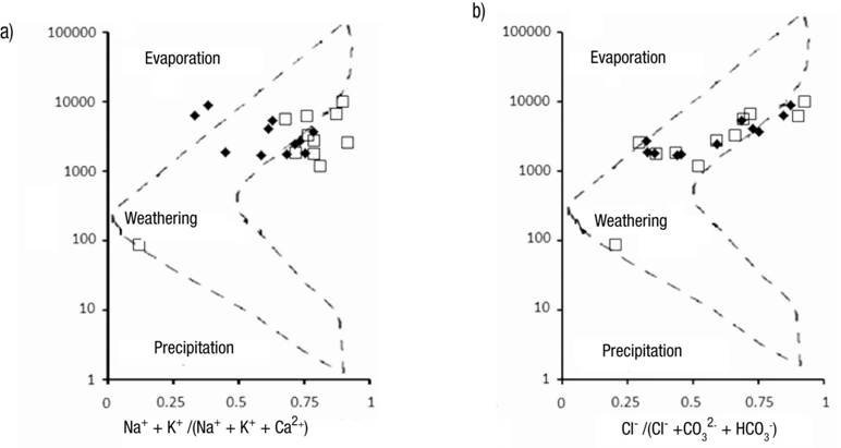 Figures 4a-b Mechanism affecting the chemical composition of the groundwater samples from the Mocorito River coastal aquifer (Sinaloa, Mexico) in Dry season (