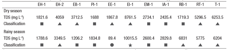 Krishna-Kumar et al. (2014) suggested that waters with low TDS (373-895 mg L-1) are influenced by rock-water interaction related to recharge, while waters with high TDS (959-4,669 mg L-1) are influenced by anthropogenic sources. A classification of the type of groundwater based on TDS content (Heath, 1983) is shown in Table 2. Most of the samples from both seasons can be classified as slightly to moderately saline, except for one sample (EI-1) took during the rainy season, which was classified as highly saline, and another (EE-1) from the same period that was classified as freshwater. According to the desirable maximal value of TDS suggested by the World Health Organization (WHO 2006; 500 mg L-1) and NOM-127-SSAI-1994 (Secretaria de Salud, 2000; 1,000 mg L-1), only 4.5 % of the samples (site EE-1) during both sea sons are considered suitable for human consumption.