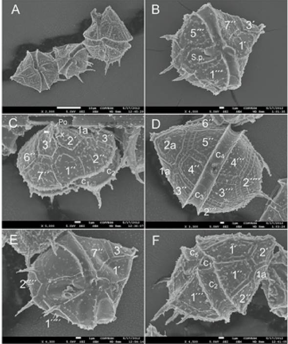 Herein, we describe the morphological variability of the cell shape and some details of the theca of B. quinquecornis sampled during a bloom on 15 July 2008 in the coastal waters in the port of Veracruz, southwestern Gulf of Mexico (Fig. 1A-F). Fixed specimens were examined in a JEOL JSM-7600F (JEOL, Ltd., Tokyo, Japan) scanning electron microscope (SEM) at a working distance of 8 mm, a voltage of 5.0 kV after a preliminary wash in distilled water followed by dehydration in a series of ethanol solutions of increasing concentration (30, 50, 70, 90, and 100%). Specimens were then air dried on 0.5´´ aluminum mounts and sputter-coated with gold-palladium using a Polaron SC7640 High-Resolution Sputter Coater (Quorum Technologies, Newhaven, SXE, UK).