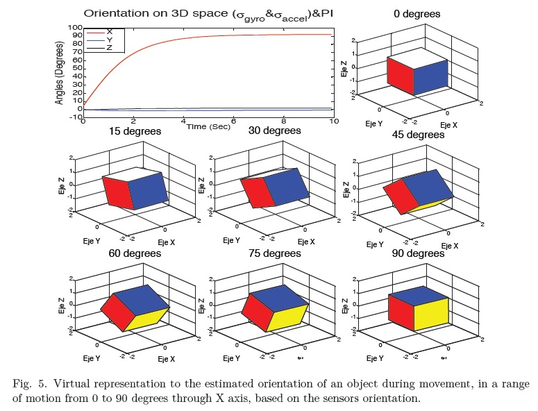 Finally, Oxyz will define the orientation of an object in 3D space based on the sensors orientation representing it through a virtual environment as a cube while performing a trajectory between 0 to 90 degrees through X axis as shown in Fig. 5.