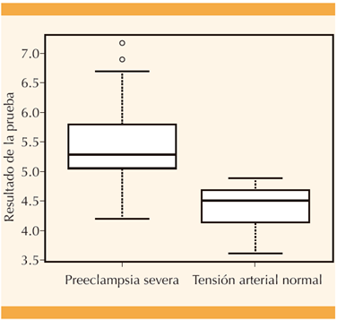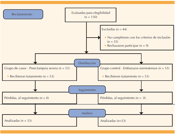Se examinaron 150 pacientes de las que 44 se negaron por no cumplir con los criterios de inclusión. Las 106 restantes se incluyeron en el estudio, a pesar de ser un poco más de las calculadas (Figura 1). Las características basales de ambos grupos fueron similares (Cuadro 2) con respecto a la edad y las semanas de embarazo, pero con diferencias en las cifras de tensión arterial. Todas las pacientes con preeclampsia se diagnosticaron con base en los criterios de crisis hipertensiva (más de 160-110 mmHg en dos ocasiones separadas por al menos seis horas) o elevación de la presión arterial (más de 140-90 mmHg en dos oportunidades separadas por al menos seis horas) con cefalea sin alivio con la medicación analgésica. No se notificaron otros signos o síntomas de gravedad.