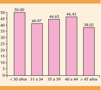 Se analizaron 743 procedimientos de fertilización in vitro con donación de ovocitos. El grupo de edad entre 40 y 44 años fue el mayoritario (42.8%). El grupo con mayor probabilidad de embarazo, en transferencia en fresco con ovocitos de donante, fue el de pacientes menores de 30 años, quienes tuvieron hasta un 50% de concentraciones de β-hCG positivas y las mayores de 45 años 38% (Figura 1). Del análisis por grupo se observó una disminución en la tasa de embarazo en las pacientes mayores de 45 años en comparación con las menores de 35 años (p = 0.02). Respecto al endometrio, las pacientes (53.9%) con un grosor endometrial entre 7 y 8 mm con concentraciones de β-hCG positivas el resultado fue estadísiticamente significativo en los grupos con endometrio menor de 6 mm comparado con el de 7 a 8 mm (p = 0.0003).