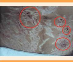 Figura 1 Exacerbación de estrías gravídicas hipopigmentadas y anchas con ulceraciones ocasionales, de bordes atróficos y eritematosos (círculo rojo).