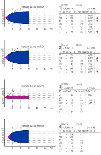 De las 21 mujeres estudiadas, 10 presentaron alguna coagulopatía (47.6%), en cuanto a los tipos de coagulopatías, tres pacientes presentaron déficit de factores de la coagulación, un caso fue de trombocitopenia, cinco casos de hipofibrinogenemia y un caso presentó dos tipos de coagulopatías (hipofibrinogenemia + hiperfibrinólisis), es decir, la coagulopatía más frecuente encontrada fue la hipofibrinogenemia. Estas pacientes presentaron una puntuación de la tromboelastometría rotacional EXTEM A5 menor a 35 mm y FIBTEM menor a 12 mm (Figura 1).