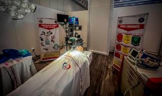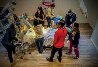 Figura 2: Escenario simulado listo para la aplicación del protocolo CALS, equipado con tecnología avanzada para recrear condiciones realistas del paciente en paro cardiaco postoperatorio.