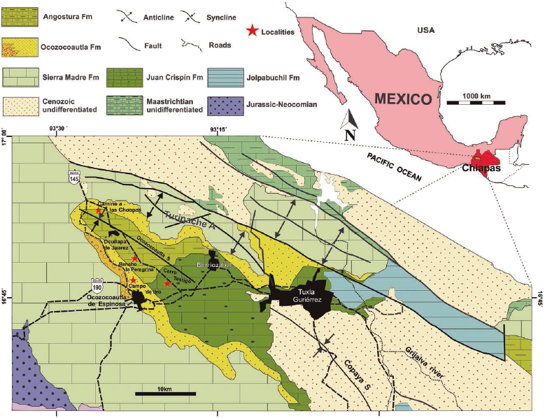 Macrofossils from the area are abundant and diverse: rudist bivalves have been reported from both formations (Müllerried, 1931, 1934; Chubb, 1959; Alencáster, 1971; Alencáster and Pons, 1992; Pons et al., 2016, 2019); inoceramid bivalves and/or ammonites from the Ocozocoautla Formation (Michaud, 1984; Bolaños and Buitrón, 1984; Alencáster and Omaña, 2006; Pons et al. 2016); bivalves and gastropods (Buitrón et al., 1995); corals (Filkorn et al., 2005; Löser, 2012), crustaceans (Vega et al, 2001, 2018; Hyžný et al, 2013), and vertebrate remains (Carbot-Chanona and Rivera-Sylva, 2011; Carbot-Chanona and Than-Marchese, 2013). Larger foraminifera are abundant in both the Ocozocoautla and Angostura formations (Ayala-Castañares, 1963; Michaud, 1987; Rosales-Domínguez et al., 1997; Omaña and Pons, 2003; Vicedo et al., 2013). Planktic foraminifera have been reported from the beds with inoceramids of the Ocozocoautla Formation (Brönnimann in Chubb, 1959; Michaud, 1984; Omaña, 2006). The benthic and planktic foraminiferal assemblage of the Angostura Formation at the El Coyol section, in the locality type of the formation, has been reported in detail by Omaña and Alencáster (2019).
