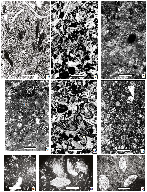 Figure 10. Microfacies, scale bar 100 µm. a) Foraminiferal-lithoclastic grainstone with Ayalaina, Peudorbitoides (Sample P-740). b) Foraminiferal-lithoclasticgrainstone with Sulcoperculina (Sample P-743). c) Planktic foraminiferal wackestone (Sample P-754). d) Foraminiferal wackestone with Praechubbina, Nezazzatinella (Sample P-744). e) Foraminiferal grainstone with Orbitoides, Sucoperculina, Vaughanina and gastropods (Sample P-750). f) Foraminiferal-algal wackestone with Chubbina, Smoutina, Valvulina, Nezzazatinella, Fleuryana, Cuneolina, algae Acroporella and gastropods (Samples P-747). g) Wackestone-packstone with Sucoperculina, Vaughanina, Nezzazatinella (Sample P-752). h), and i) Foraminiferal wackestone with an association mostly composed by Smoutina cruysi Drooger, as well as Sulcoperculina and Valvulina (P-758).