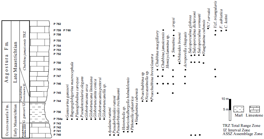 Later, Michaud (1987, p. 171) analyzed the planktic foraminifera from washed samples from the interval with inoceramids of the Ocozocoautla Formation and dated it as late Campanian-Maastrichtian. He characterized the Angostura Formation by the presence of Chubbina jamaicensis Robinson and indicated that it could be of Campanian-Maastrichtian, although in the Ocozocoautla and El Naranjo sections Chubbina jamaicensis Robinson was found over the planktic levels, so it was assigned to the Maastrichtian age.