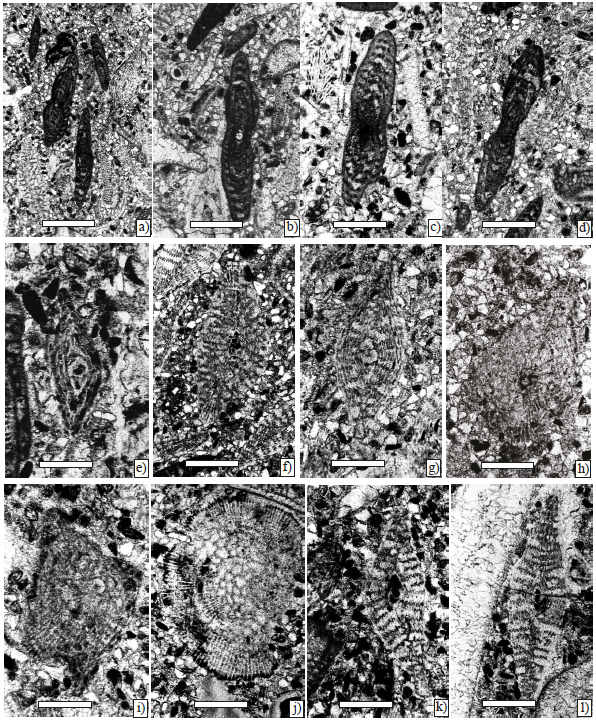 Figure 3. Larger foraminifera from Ocozocoautla Formation, scale bar 250 µm. a) Ayalaina rutteni (Palmer) and Pseudorbitoides; axial sections (Sample P-740). b) Ayalaina rutteni (Palmer), axial section; c), d) subaxial section (Sample P-740). e), f), g), h), and i) Pseudorbitoides rutteni Brönnimann; e) axial section of juvenile specimen; f), g) axial section; h) subequatorial section; i) tangential section (Sample P-740). j), k), and l) Pseudorbitoides trechmanni Douvillé; j) subequatorial section; k) l) subaxial section (Sample P-740).