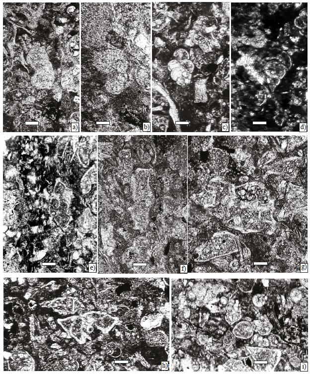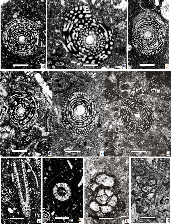 Figure 6. Larger foraminifera from Angostura Formation, scale bar 250 µm. a) Chubbina macgillavryi Robinson, Equatorial sections(Sample P-747). b) Chubbina macgillavryi Robinson, equatorial sections(Sample P-746). c) Chubbina jamaicensis Robinson, equatorial sections (Sample P-747). d) Chubbina jamaicensis Robinson, equatorial sections (Sample P-746). e) Chubbina macgillavryi Robinson, equatorial sections (Sample P-745). f) Chubbina jamaicensis Robinson, equatorial sections (Sample P-760). g), and h) Acroporella chiapasis Deloffre, Fourcade y Michaud (Sample P-760). i) Hemicyclammina sp. (Sample P-746). j) Valvulina cf. V. triangularis d’ Orbigny (Sample P 7).
