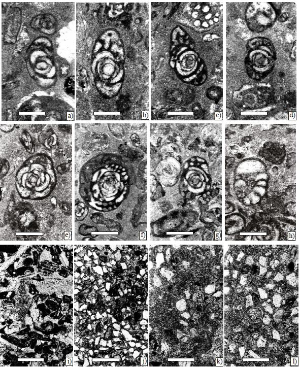 7. Foraminiferal wackestone with an association mostly composed by Smoutina, as well as Valvulina and Sulcoperculina (P-758) (Figures 10h and 10i).
