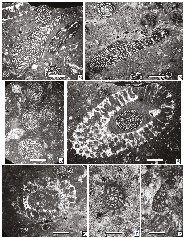 Figure 7. Benthic foraminifera and algae from Angostura Formation, scale bar 250 µm. a) and b) Chubbina jamaicensis Robinson, axial sections of a microspheric form (Sample P-749). c) Chubbina jamaicensis Robinson, equatorial sections of megalospheric form and Smoutina cruysi Drooger (Sample P-749). d), and e) Neogyroporella? servaisi Michaud, longitudinal and axial sections (Sample P-749). f) Fleuryana adriatica De Castro, Drobne and Gušić, equatorial section (Sample P-749). g) Cuneolina ketini Inan (Sample P-749).