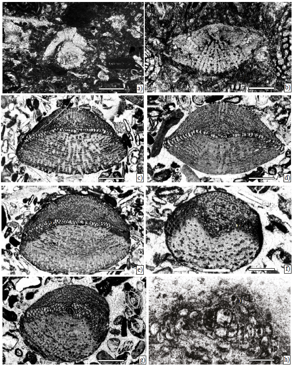 Figure 8. Larger foraminifera from Angostura Formation, scale bar 200 µm. a) Sulcoperculina globosa de Cizancourt, axial section (Sample P-752). b) Smoutina cruysi Drooger, axial section (Sample P-749). c) Orbitoides browni (Ellis), axial section; d), e) Subaxial sections; f), g) Tangential sections; h) Axial section of the embryonic apparatus (Sample P-750).