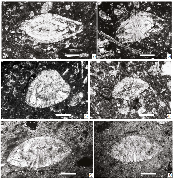 5. Foraminiferal-algal packstone-wackestone with alveolinids such as Chubbina, in addition to Smoutina, Valvulina, Nezzazatinella, Fleuryana, Cuneolina and algae Acroporella and Neogyroporella? (Samples P-746-P-749) (Figure 10f).