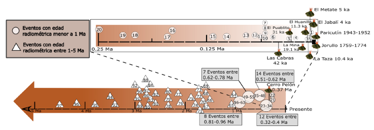 Maciel-Peña et al. (2014) reportaron un flujo de lava de polaridad normal con edad de 0.96 ± 0.07 Ma. La misma lava muestreada en una localidad diferente produjo una magnetización de polaridad inversa con un VGPlat igual a -49°, que está cerca de una dirección de transición (Garcia Ruiz et al., 2017). En cambio, dos flujos estudiados por Michalk et al., (2013) con edades de 0.96 y 1.08 Ma, respectivamente, arrojaron direcciones de polaridad normales y, por lo tanto, podrían corresponder al sub-Cron de Jaramillo (Doell y Dalrymple, 1966; Seward,1974; Laj y Channell, 2007) de 0.99-1.07 Ma. El evento de Jaramillo fue descubierto por Doell y Dalrymple (1966) en rocas volcánicas en la Caldera de los Valles (Santa Fe, Nuevo México); las mismas fueron datadas aproximadamente en 0.9 Ma. (Singer et al., 1999). El evento de Jaramillo ha sido ampliamente documentado ya que se ha observado tanto en sedimentos marinos como continentales (Kravchinsky, 2017; Channell et al., 2020), y se considera un evento global (Jacobs, 1994).