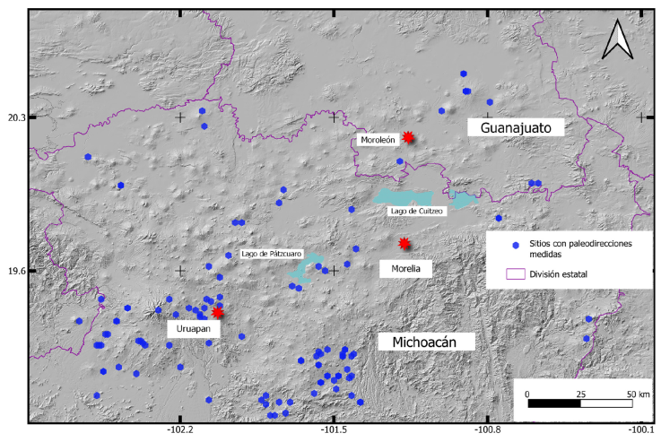 El trabajo de Maciel-Peña et al. (2014) es un estudio paleomagnético realizado en 37 flujos de lava localizados en la región de Tacámbaro y el Jorullo, estado de Michoacán, en la parte sur del CVGM. Las lavas estudiadas provienen principalmente de volcanes monogenéticos con edades menores a 4 Ma. A partir de la posición del polo geomagnético promedio concluyen que no se han presentado movimientos tectónicos significativos en la región desde el emplazamiento de las lavas. Concluyen también que la variación paleosecular observada se ajusta a los modelos geomagnéticos para la misma región y edad. Con las edades asociadas a los flujos de lava establecen una correlación con la escala geomagnética de polaridades destacandose la evidencia de una posible excursión geomagnética Intra Jaramillo.