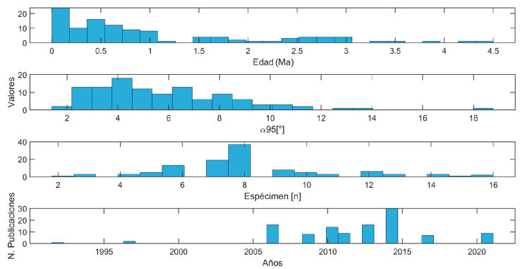 Figura 4 Histogramas de las edades de las direcciones en la base de datos, se indica el valor de α95, el número de especímenes y las publicaciones realizadas hasta la fecha.
