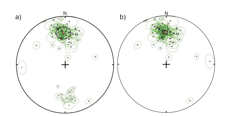 Figura 5 Estereogramas de iguales áreas de paleodireciones medias de flujos de lava asociadas al Campo Volcánico Michoacán-Guanajuato, a) Direcciones normales, transicionales e invertidas, b) direcciones normalizadas.