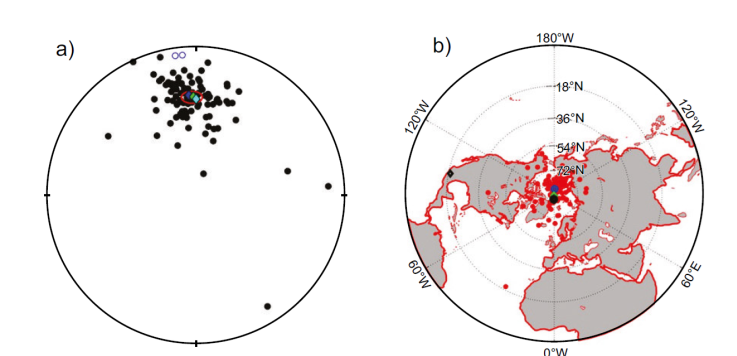 Figura 6 a) Paleodirecion media global obtenida en este estudio, su cono de confianza, comparadas con las direcciones esperadas recalculadas del Cratón de Norteamérica y su dipolo geocéntrico axial (GAD) (azul, verde y magenta), b) Posicion de los polos geomagnéticos virtuales por cada flujo de lava y polo paleo-magnético correspondiente (en negro). Comparado con los polos de referencia para el Cratón de Norteamérica (azul y verde).