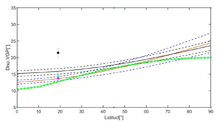 Johnson et al. (2008) publicaron una síntesis de una nueva generación de datos paleomagneticos, reportando la dispersión del polo virtual geomagnético versus latitud. También se reportaron dos ejemplos de modelos de dispersión de VGP (Virtual Geomagnetic Poles, por sus siglas en inglés) con respecto a la latitud; el Modelo G y el TK03. Es de llamar la atención que la dependencia latitudinal de la dispersión para el conjunto de datos compilados por Johnson et al. (2008) parecía ser poco significativa. Los datos provenientes de bajas latitudes parecen estar más dispersos, mientras que los que provienen de latitudes altas están menos dispersos. Sin embargo, la contribución de Lawrence et al. (2009) sugiere que el parámetro de la dispersión S B no depende de la latitud, y subraya la importancia de incluir nuevos conjuntos de datos de buena calidad. Es de resaltar que la visión de la dependencia de la latitud con la dispersión de VGP presentadas por Johnson et al. (2008) depende fundamentalmente de un conjunto de datos cercanos a los 20° N, incluidos una gran cantidad de datos del centro y oeste de México.