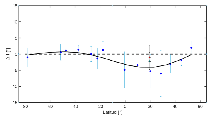 Figura 8 Anomalía de la Inclinación, datos en azul y curva en negro basada en el trabajo de Johnson et al. (2008), con datos en triangulo anomalía de la inclinación para el presente estudio rojo todas, las direcciones, magenta 60° y cian 45°.