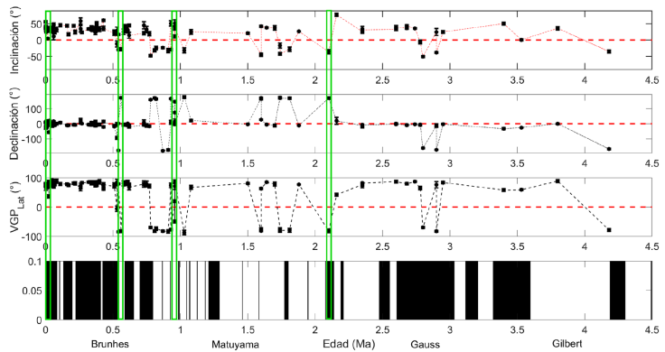 De 112 unidades de enfriamiento independientes, 4 lavas dieron direcciones con una paleolatitud geomagnética virtual (VGP) < 45° (direcciones intermedias). Otros dos sitios dentro del cron geomagnético de polaridad normal de Brunhes produjeron direcciones de polaridad inversa. Finalmente, 7 sitios dentro del cron de polaridad inversa de Matuyama arrojaron direcciones cercanas a las actuales.