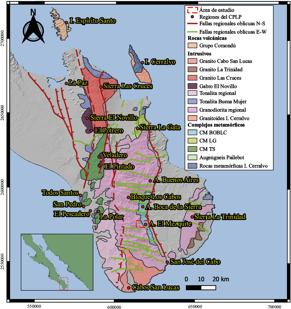 En la región sur de la Península de Baja California afloran rocas ígneas, metamórficas y sedimentarias. Los intrusivos del Bloque Los Cabos son agrupados en ensambles pre, sin y pos-tectónicos (Aranda-Gómez y Pérez-Venzor, 1989; Pérez-Venzor, 2013). Las rocas intrusivas del CPLP fueron emplazadas por lo menos en dos periodos de subducción. El primero evidenciado por la deformación penetrativa de rocas metamórficas e ígneas (foliación, lineación y pliegues). Mientras que la evidencia de un segundo evento magmático es la presencia de un metamorfismo de contacto, reflejada en las migmatitas que se encuentran en las proximidades de grandes intrusivos en la sierra La Laguna.