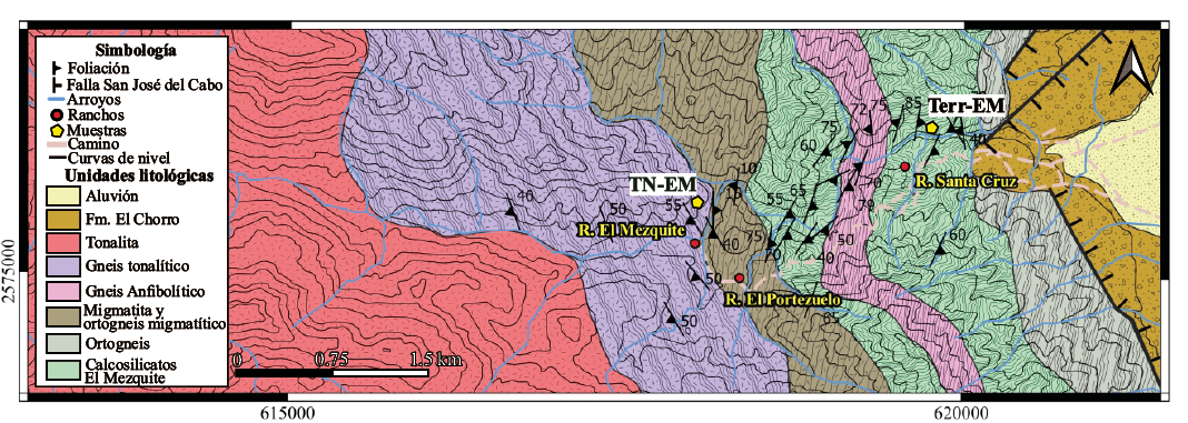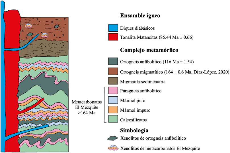 Se muestrearon las diferentes capas de los calcosilicatos El Mezquite, que incluyen mármol puro, mármol rico en sílice, calcosilicatos y gneis anfibolítico para realizar un análisis petrográfico detallado. También se muestrearon la tonalita Matancitas y el gneis anfibolítico para realizar fechamientos por U-Pb en zircón y termometría de Ti en zircón.