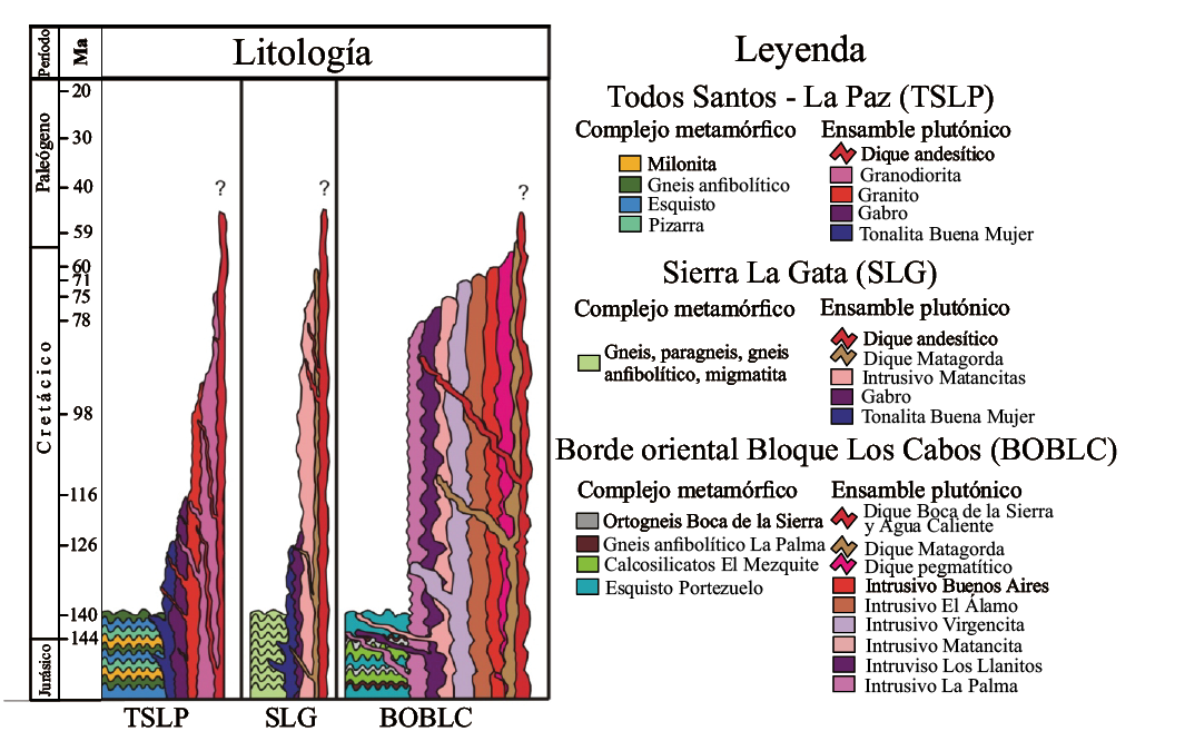 Figura 2 Columna estratigráfica simplificada del Bloque Los Cabos (tomado y modificado de Pérez-Venzor, 2013).