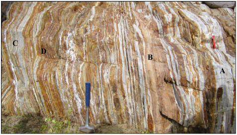 Figura 4 Afloramiento de metacarbonatos. Se observa la alternancia típica de capas de los metacarbonatos El Mezquite. Mármol puro (A), mármol impuro (B), esquisto calcosilicatado (C) y gneis anfibolítico (D). Coordenadas UTM 618583E - 2575507N.