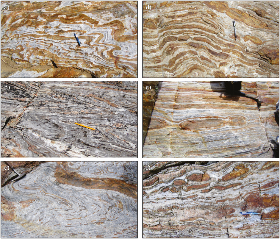 Figura 5. Evidencia de la deformación en la unidad de metacarbonatos El Mezquite. La amplia variedad de pliegues registrada en la unidad presenta pliegues armónicos (a), chevrón (b) disarmónicos (c). La amplitud de onda, el espesor de los pliegues y el tipo varían durante los 2 km de afloramiento. En d), e) y f) se observan diferentes tipos de estructuras de rosario en sus diferentes estadios, incipiente (apenas desarrollados, d) hasta completamente estrangulados (d y e). Coordenadas UTM 619233E - 2575922N.