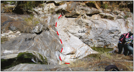 Figura 6 Contacto entre las unidades calcosilicatadas (cal) y gneis anfibolítico (g.anf). UTM 619357E - 2575934N.