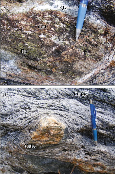 Figura 7 a) Xenolito de la unidad metacarbonatos El Mezquite dentro del intrusivo tonalítico. Se observa una paragénesis granate (Grt) + cuarzo (Qz) + epidota (Ep), que evidencia un metamorfismo retrogrado. b) Xenolito de roca calcosilicatada contenido en la unidad de ortogneis Boca de la Sierra. Ort.G (ortogneis), Calc (calcosilicatos). Coordenadas UTM 618028E - 2575247N.
