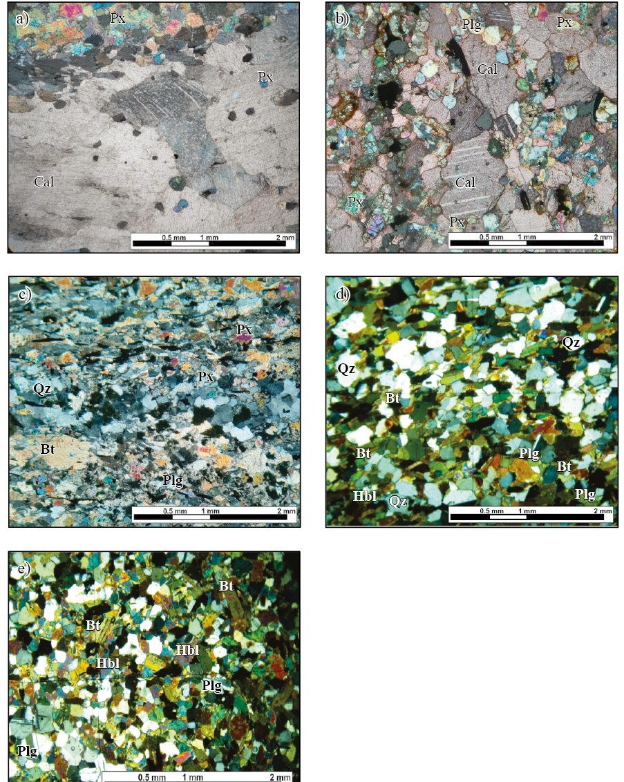 Figura 8 Fotomicrografías de las diferentes unidades reconocidas dentro de la unidad metacarbonatos El Mezquite. a) corresponde a la capa de mármol puro, b) corresponde a la capa mármol impuro, c) corresponde a la capa de esquisto calcosilicatado d) corresponde a la capa de gneis anfibolítico (protolito volcánico) y e) corresponde a gneis anfibolítico (protolito ígneo intrusivo). Px (piroxeno), Cal (calcita), Qz (cuarzo), Bt (Biotita), Plg (plagioclasa) Hbl (hornblenda).