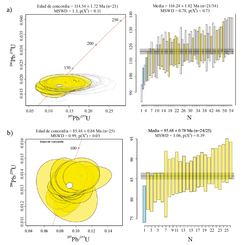 Para las edades 207Pb/235U y 206Pb/238U obtenidas de los zircones de la tonalita Matancitas y del gneis anfibolítico, se utilizó como criterio descartar aquellos zircones que tienen una discordancia mayor a 15%. El cálculo de la edad de concordia y media ponderada fue a partir de los zircones más concordantes, utilizando la versión en línea de IsoplotR (Vermeesch, 2018); además fueron elaborados los diagramas de concordia de Wetherill. Se analizaron 30 zircones para la tonalita y 49 para el gneis anfibolítico, los resultados de los análisis isotópicos están contenidos en el Material Suplemento. La muestra TN-EM (tonalita) contiene zircones prismáticos alargados con una relación largo:ancho de 4:1 y en su mayoría con ambas pirámides bien desarrolladas. En las imágenes de catodoluminiscencia, no se observaron núcleos que supusieran herencias y en general tienen una catodoluminiscencia homogénea. Los análisis se realizaron en las zonas cercanas al borde, aunque se escogieron algunos núcleos, resultando en edades similares. También fue posible observar zonas del zircón con posibles inclusiones de apatito que fueron descartadas. Por otro lado, la muestra Terr-EM (gneis anfibolítico) contiene zircones de prismas cortos con una relación largo:ancho de 2:1. En su mayoría presentan formas euhedrales, aunque algunas son también subhedrales. Bajo catodoluminiscencia se observaron, en algunos cristales, aparentes núcleos heredados, aunque básicamente todos los datos resultaron similares. De igual forma, la catodoluminicencia permitió descartar zonas de posibles inclusiones de apatitos. La ocurrencia de bordes que pudieran representar recristalización asociada a metamorfismo no es evidente en estas muestras. En la tonalita Matancitas (TN-EM) la edad de concordia obtenida es de 85.7 ± 0.5 Ma y una edad ponderada de 85.7 ± 0.8 Ma (Figura 9), mientras que para el gneis anfibolítico (Terr-EM) la edad de concordia es 116.2 ± 0.9 Ma y una edad ponderada de 116.2 ± 1.8 Ma (Figura 9). En este trabajo consideramos que la edad de concordia es la mejor, dado que el valor de MSWD (Mean Square Weighted Deviates) es próximo a 1, lo que estadísticamente supone que la edad se ajusta a una distribución normal.
