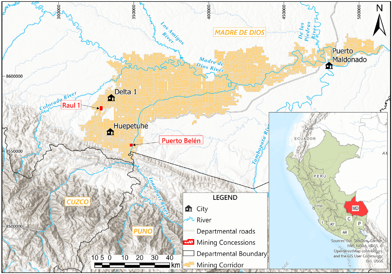The study area includes two mining concessions: Puerto Belén, located in the Huepetuhe mining district, and Raul 1, situated in the Delta 1 mining district. Both concessions belong to the Province of Manu, within the Madre de Dios Department, in southeastern Peru (Figure 1). Madre de Dios is part of the Peruvian Amazon, bordering Brazil to the east and Bolivia to the southeast. The study area is approximately 300 km east of Cusco and 150 km southwest of Puerto Maldonado, the capital of Madre de Dios. The mining sites are located within the Amazonian lowlands, characterized by extensive river networks and alluvial deposits rich in gold. The Huepetuhe and Delta 1 districts are among the most active mining zones in the region, with ASGM being the dominant economic activity. The Puerto Belén mining concession (INGEMMET Code: 070007900) is currently undergoing formalization and is owned by Mr. Damián Alfredo Ampuero Huaquisto. The Raul 1 concession (INGEMMET Code: 070007807) is held by Los Tres Emblemas Dorados de Oro S.A.C. The concessions lie within the Inambari river basin, an area characterized for its Quaternary alluvial deposits, which host significant gold mineralization derived from the erosion of the Andean Cordillera. The geographic coordinates of the study area, in UTM WGS84 Zone 19S, are approximately 347810.600 mE, and 8553628.060 mN for Puerto Belén; and 328810.210 mE and 8577628.460 mN for Raul 1.