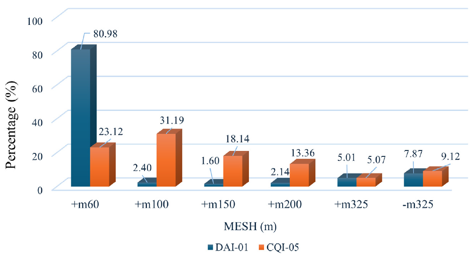 Samples DAI-01 and CQI-05, belonging to the Puerto Belén concession and Raul 1 concession, respectively, were separated in six grain-size fractions by passing the samples through sieves of mesh size 60, 100, 150, 200, and 325. The distribution of gold in the sample DAI-01, indicates that 80.98 % of free gold particles are concentrated on mesh 60 (+m60), 2.40 % is below mesh 60 and above mesh 100 (-m60 and +m100), 1.60 % is below mesh 100 and above mesh 150 (-m100 and +m150), 2.14 % is below mesh 150 and above mesh 200 (-m150 and +m200), 5.01 % is below 200 mesh and above 325 mesh (-m200 and +m325), and 7.87 % is below 325 mesh (-m325) (Figure 10).