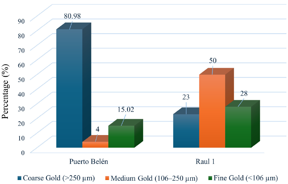 In contrast, the Raúl 1 concession presents a mineralogical composition dominated by silica and a lower proportion of heavy minerals, reflected in a more balanced gold particle size distribution: coarse (23.12 %), medium (49.33 %), and fine (27.55 %) (Figure 11). The higher proportion of finer particles suggests a depositional environment that has been subjected to greater hydraulic energy, facilitating sedimentary reworking and redistributing gold into different size fractions (Alves et al., 2020). This variability may be influenced by the river dynamics in the area, which not only transport finer particles but also contribute to the differential concentration of gold depending on changes in flow velocity and sediment load.